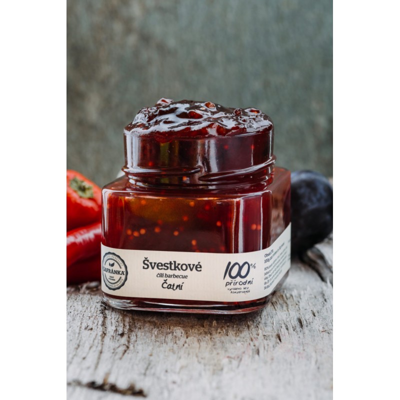Složení: Švestkové čili čatní (270g) v sobě skrývá 500g českých bio švestek, čili papričky, bio cukr třtinový, jablečný ocet, hořčičná semínka, koriandr, zázvor